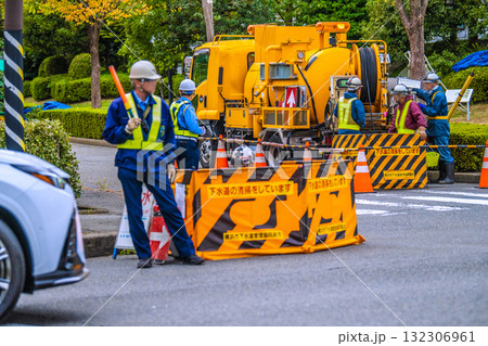 日本の横浜都市景観「下水道の清掃をしています」=横浜市内で