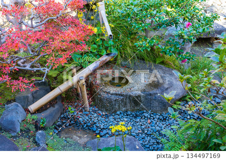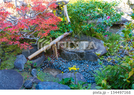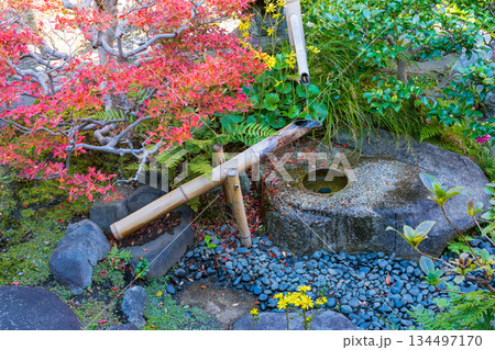 秋の京都 詩仙堂 紅葉に包まれた鹿おどし
