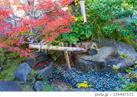日本の春の京都 世界文化遺産の天龍寺 庭園のししおどし 水溜まりに浮かぶ桜の花びら