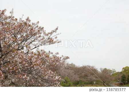 桜の見頃の終わり 斜面に並んだ桜の木は葉っぱが出始めている