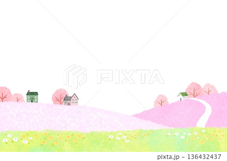 桜が咲く野山と草原と家の春イメージの風景イラスト 白背景