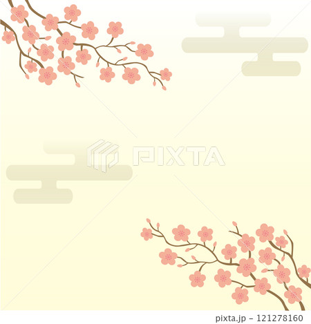 淡いピンクの梅と桜が散りばめられた和風フレーム背景素材