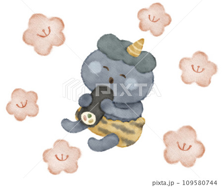 梅の花とかわいい青鬼の全身イラスト