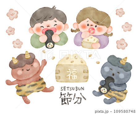 節分の日ふんわりかわいいイラスト素材セット 水彩