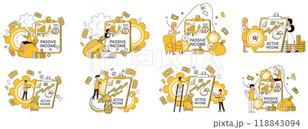 Strategic Management and Finance set. Diverse business scenarios including profit generation, risk, investment, planning, and governance. Corporate financial strategies in action. Vector illustration.
