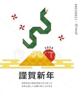 ヘビと富士山のシンプルなイラスト年賀状のテンプレート 2025年 縦