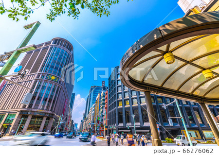 日本の東京都市景観 日本橋三越や日本国道路元標(複製)などを望む
