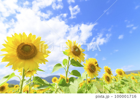 北海道 夏の青空とひまわりの風景