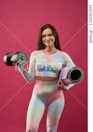 Cheerful Caucasian girl in light activewear, raising dumbbell, while looking at camera. Portrait of nice lady standing with yoga mat, having workout, isolated on pink studio background. Sport concept.