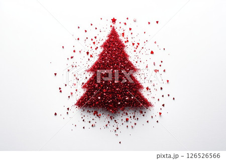 Red glitter Christmas tree shape created with sparkling decorations on a white background