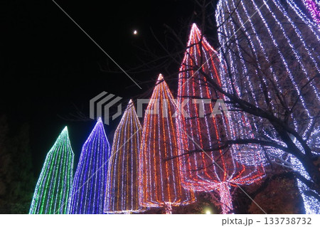 ライトアップされたイルミネーションと月