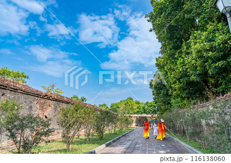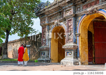 ベトナム最後の王朝の栄華を残す世界遺産フエ王宮の赤い回廊でナショナルデーに正装して歩く女性