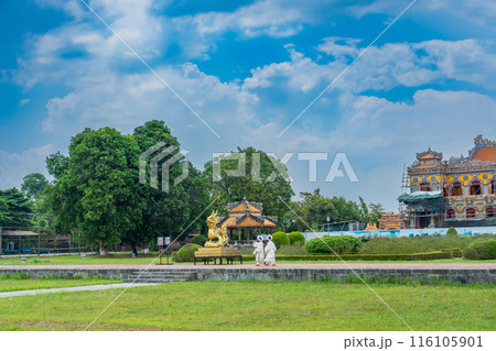 ベトナム最後の王朝の栄華を残す世界遺産フエ王宮の黄金の龍の前でナショナルデーに正装して歩く女性