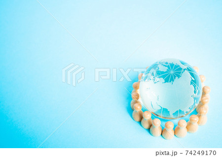 地球と手を繋ぐ人々のイメージ ガラスの地球儀とミニチュア人形