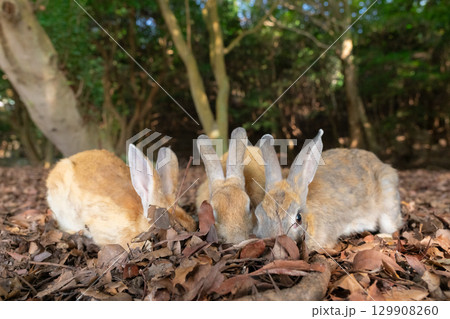 落ち葉で顔を隠すウサギ三兄弟