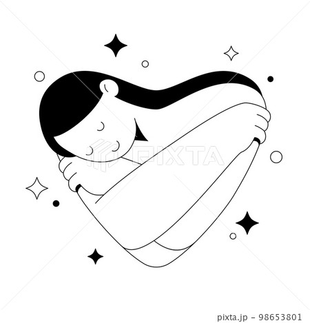 セルフハグ。若い女性が自分自身をハグしているイラスト