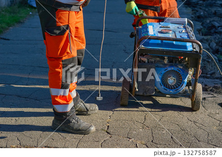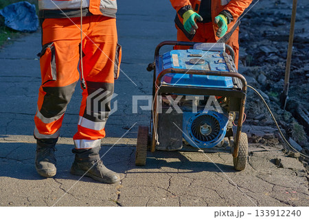 Road workers prepare to start a generator with a starter actuator cord