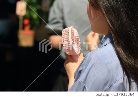 夏の救世主! 携帯扇風機で涼む女性のイラスト素材