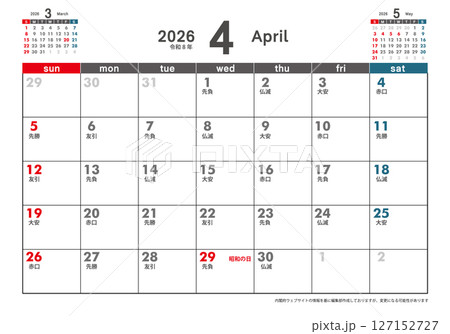 日曜始まり卓上カレンダー令和8年 2026年4月 3ヶ月表示 六曜 シンプルカレンダー素材