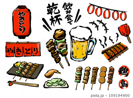 焼き鳥の宴会イラストセット 手描き筆タッチ