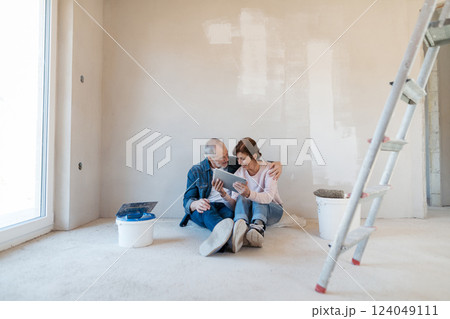 Senior couple renovating their home, browsing for inspirations on tablet.