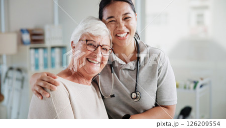 Senior woman, physiotherapist and hug in portrait at clinic with smile, recovery or medical services. People, elderly patient and embrace for wellness, happy or support in rehabilitation at hospital