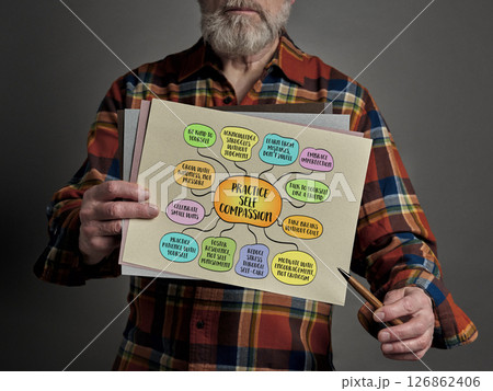 Practice self compassion concept, treating yourself with kindness, understanding, and empathy, mind map sketch infographics.