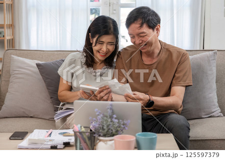 Elderly Couple Managing Family Finances Together at Home with Laptop and Documents for Budget Planning