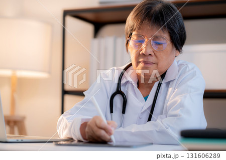 Senior asian doctor writing prescription or document on tablet in clinic office.
