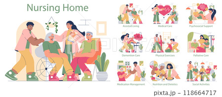 Nursing Home concept. Comprehensive elderly care services with diverse activities depicted in a friendly setting. Assisted living, medical attention, and emotional support. Vector illustration.