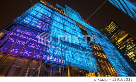 A vibrant digital landscape fills the night with glowing lines and beams, showcasing futuristic technology at dusk. Generative AI