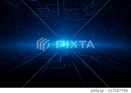 AI generated 3D digital environment showing a glowing data chamber with geometric grid lines and a bright energy portal symbolizing futuristic computing logic systems and immersive cyber architecture