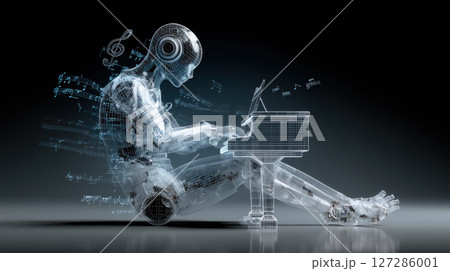 Digital humanoid robot plays piano, surrounded by musical notes, showcasing AI music generating