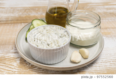 Traditional greek yogurt sauce Tzatziki,dressing in white bowl, made of grated cucumbers, sour cream yogurt,olive oil,garlic,herbs with ingredients on wooden table. Close up, horizontal
