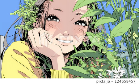 花束に頬を寄せる少女のやさしいイラスト
