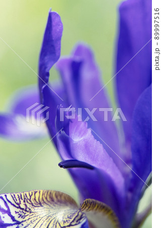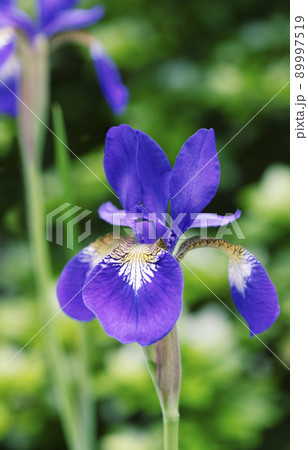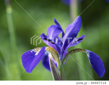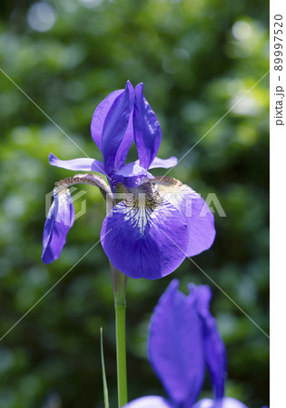 昼の日光を受けて光が透けて光るアヤメの花_晴天直射日光縦1