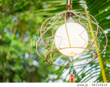 An old iron lantern with an orange glow illuminates a circle. It is located in a park with green leaves.
