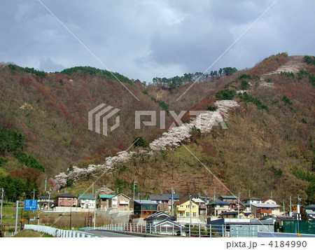 信州 安曇野 光城山の桜並木遠望 麓から山頂に向かって桜が咲き誇る