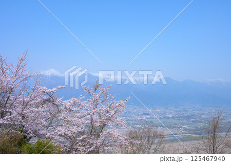 桜のお花見 光城山から見る北アルプスと安曇野の風景