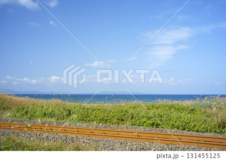 秋晴れの陸奥湾と大湊線の線路 青森県横浜町