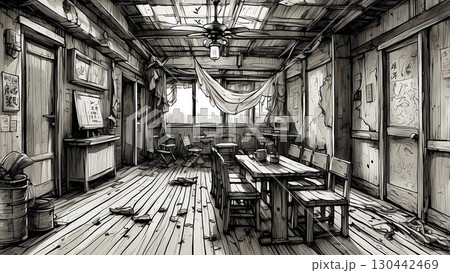 ゲーム背景 サイバーシティ九龍城塞的なスラム街ビルの廃墟室内風景