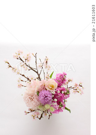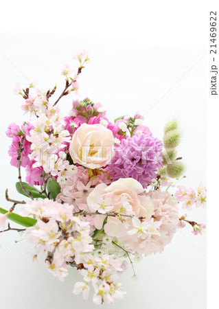 桜とヒヤシンスとチューリップとストックのアレンジ(縦 部分 右向き)