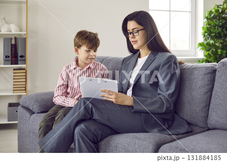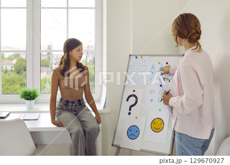 Teenager at office meeting answers questions and tasks from professional school child psychologist.