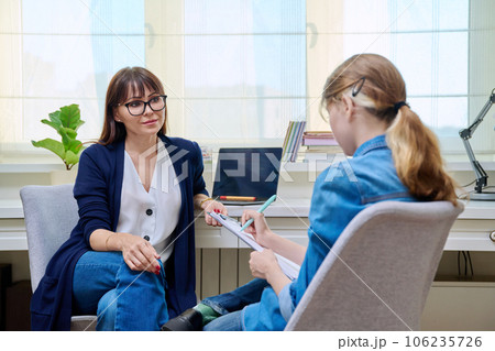 Teenage girl is talking to female psychotherapist while sitting in doctor's office.