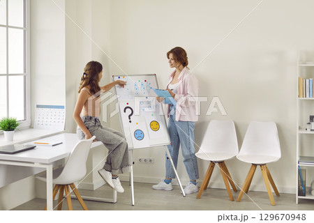School child psychologist at meeting in the office asks questions and gives tasks to schoolgirl.