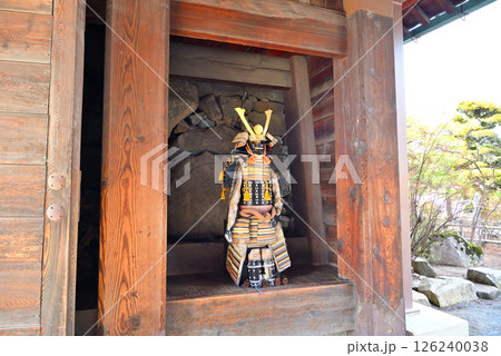 中部地方・松本城・お城の観覧エリア入口、黒門に置かれた鎧兜・長野県松本市(1)