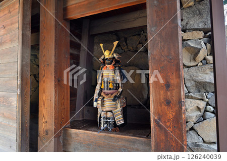 中部地方・松本城・お城の観覧エリア入口、黒門に置かれた鎧兜・長野県松本市(2)