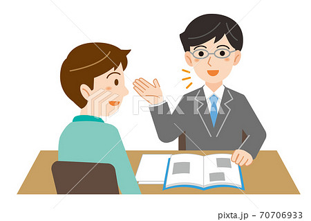 相談に来た男性に説明をするビジネススーツの男性のイラスト/白背景