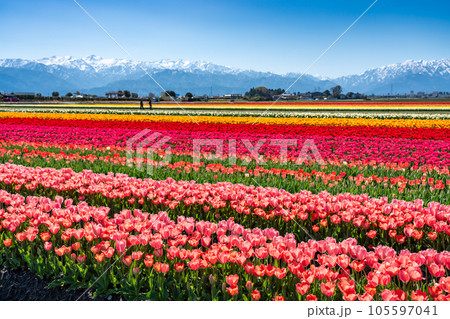 富山県入善町 にゅうぜんフラワーロード2023のチューリップ畑と残雪の北アルプス