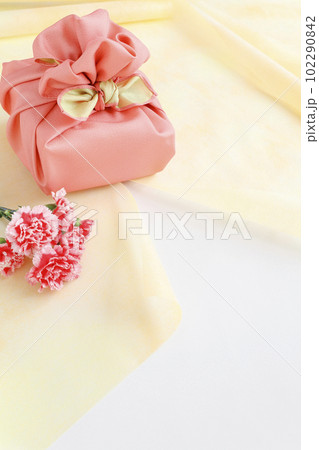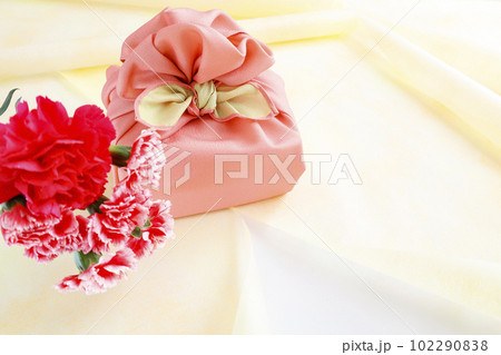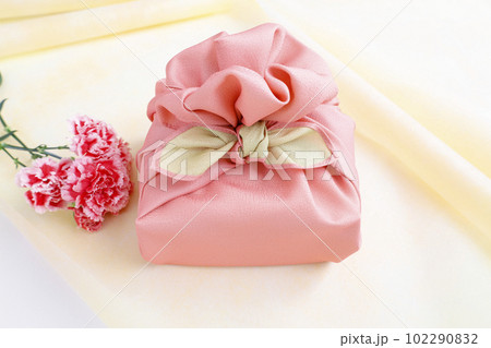 ピンクの風呂敷でラッピングしたプレゼントと花